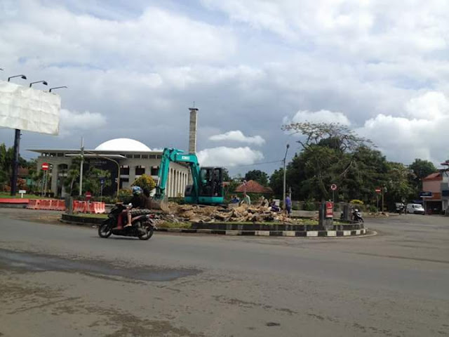 | Patung tiga ikan di bundaran Pangandaran sudah rata dengan tanah |